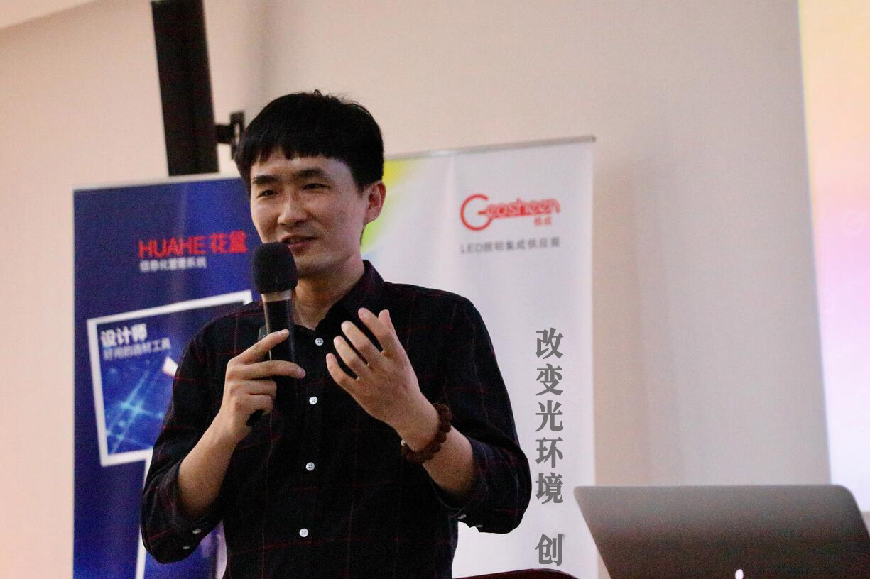 Geosheen极成光电设计部经理丁守国先生做了“商业空间环境光应用”的分享。他通过多份图例讲解了根据不同空间格局和场景材质进行专业化灯光改造前后的鲜明对比,直观地呈现出优秀灯光运用的价值所在。