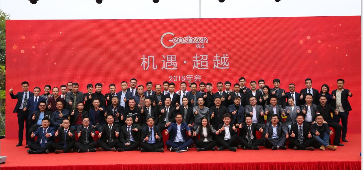 2018年1月23日,以“机遇·超越”为主题迎新庆典晚会在极成工业园隆重举行,此次庆典晚会参加人员除了Geosheen极成全体员工之外,还有政商界代表、合作伙伴、部分经销商代表等约1000人欢聚一堂,共度联欢。
