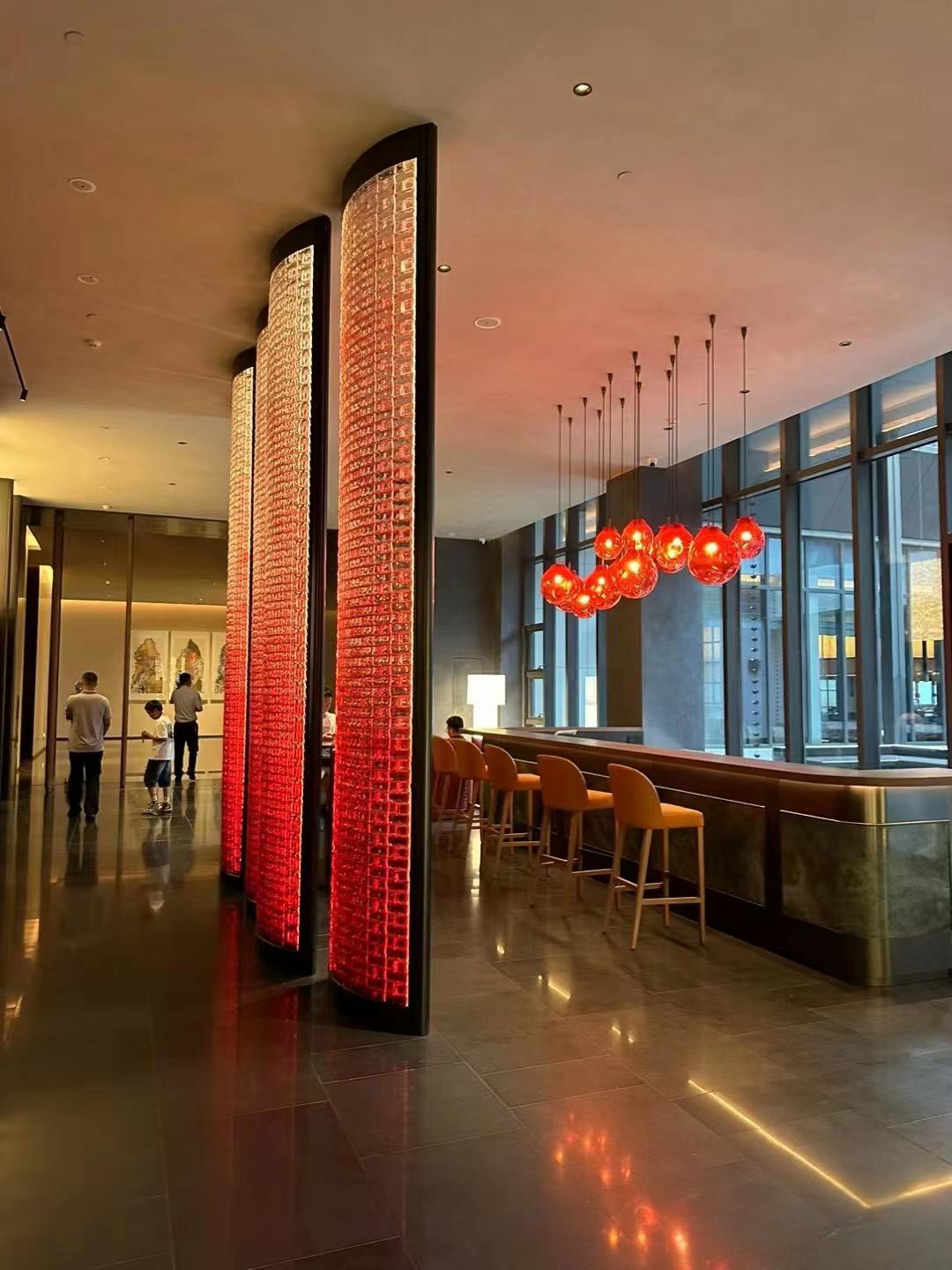 酒店大堂的灯光设计根据大堂空间的高低错落与造型的独特,设计师们精心挑选了不同的配灯方案,顶部的凹槽巧妙地采用了灯带暗藏的手法,使得光线如流星般悄然划过,为空间增添了一抹神秘的色彩。而那平整的天花板下,隐藏着精巧的防眩天花灯,宛如夜空中的繁星,静静地为宾客提供柔和而温暖的光芒,让他们在享受奢华的同时,也能感受到宾至如归的温馨。