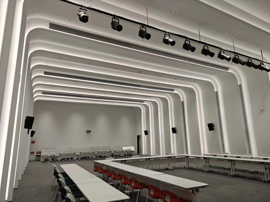 多功能室的魅力在于它随着使用场景的切换而展现不同的风貌,如同一位善于变脸的艺术家。为了满足这多变的需求,其设计风格需兼具灵动与实用。专业的灯光设计则成为实现这一目标的得力助手。弧形的线条装饰巧妙地隐藏着软灯带,当灯光亮起时如同流星划过夜空,为空间注入了科技感和未来氛围。而装饰凹槽间镶嵌的防眩天花灯,则像是点点繁星,为各个场景提供了恰到好处的照明。这两者的完美结合,使得整个空间如同一个梦幻的魔法世界,充满了无限可能与惊喜。