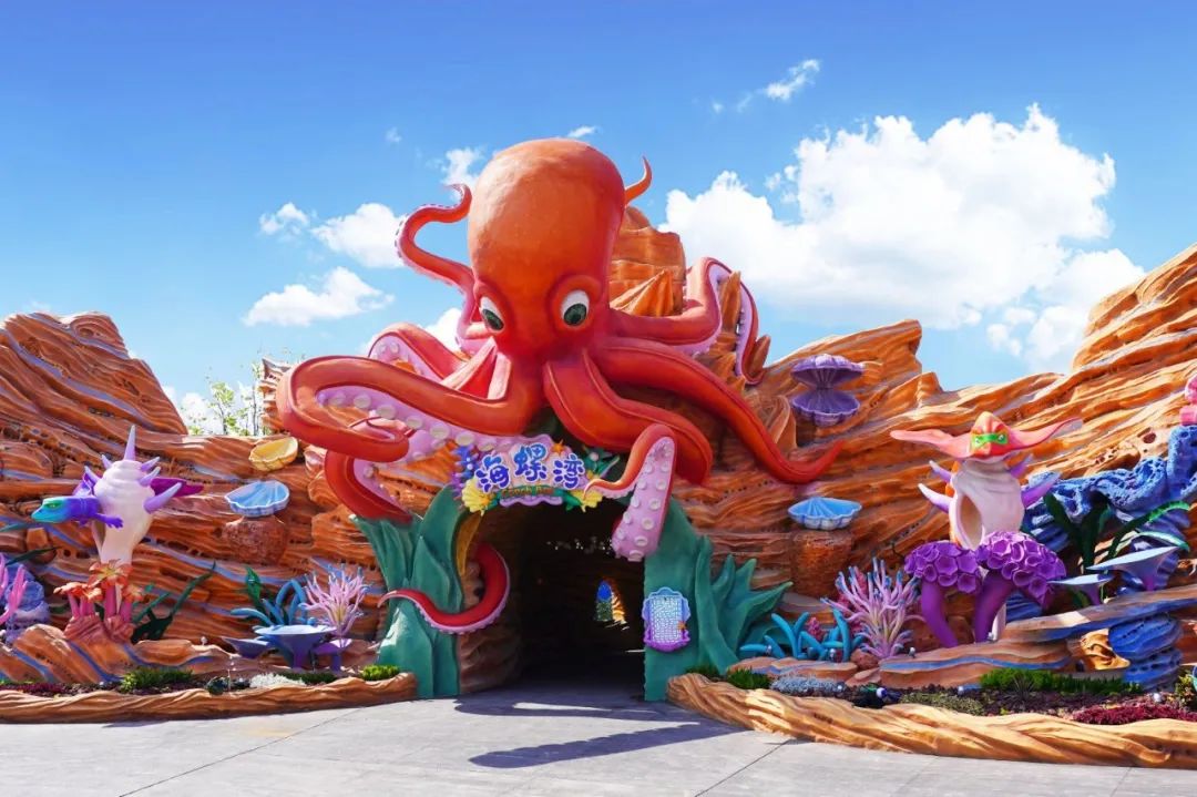 海螺湾的入口处有个巨大的墨鱼,周围会喷射水雾,氛围感做的很到位。剧场的表演主打4D技术×立体巨屏通过逼真的视觉效果,结合活动机模,烟雾,光电等特技,还原了一个色彩斑斓的海洋世界。