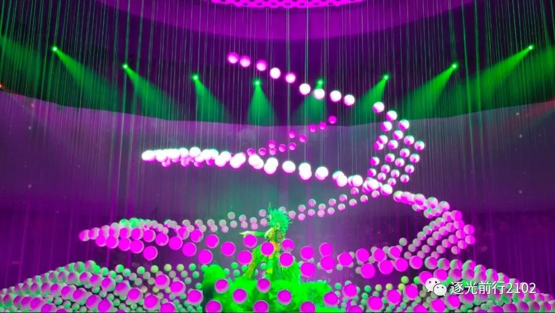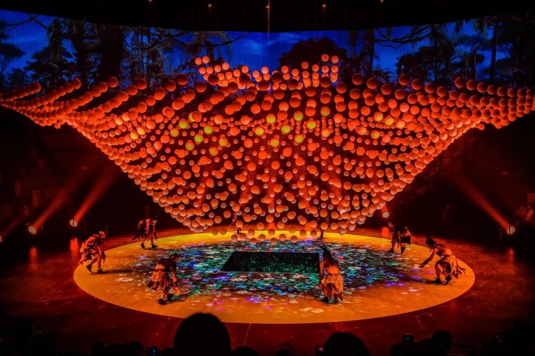 表演上安排了无数的高科技魔球上下起伏营造出宏大的氛围,演员们穿着道具服,化着特定的妆,扮演着恐龙、蜘蛛和原始人。故事中设置了偷蛋还蛋的情节,展现了人与自然和谐相处的动人场景。