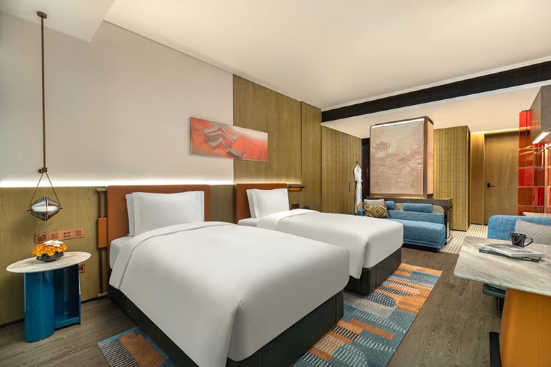 酒店拥有162间时尚灵动的客房和套房,大部分房间可透过开阔落地窗一揽梅溪湖旖旎。细节之处缀以南宋书院元素和当代艺术线条之美。橙黄橘绿的色彩搭配和璀璨绽放的烟花装饰画,演绎橘子洲头的五彩斑斓。