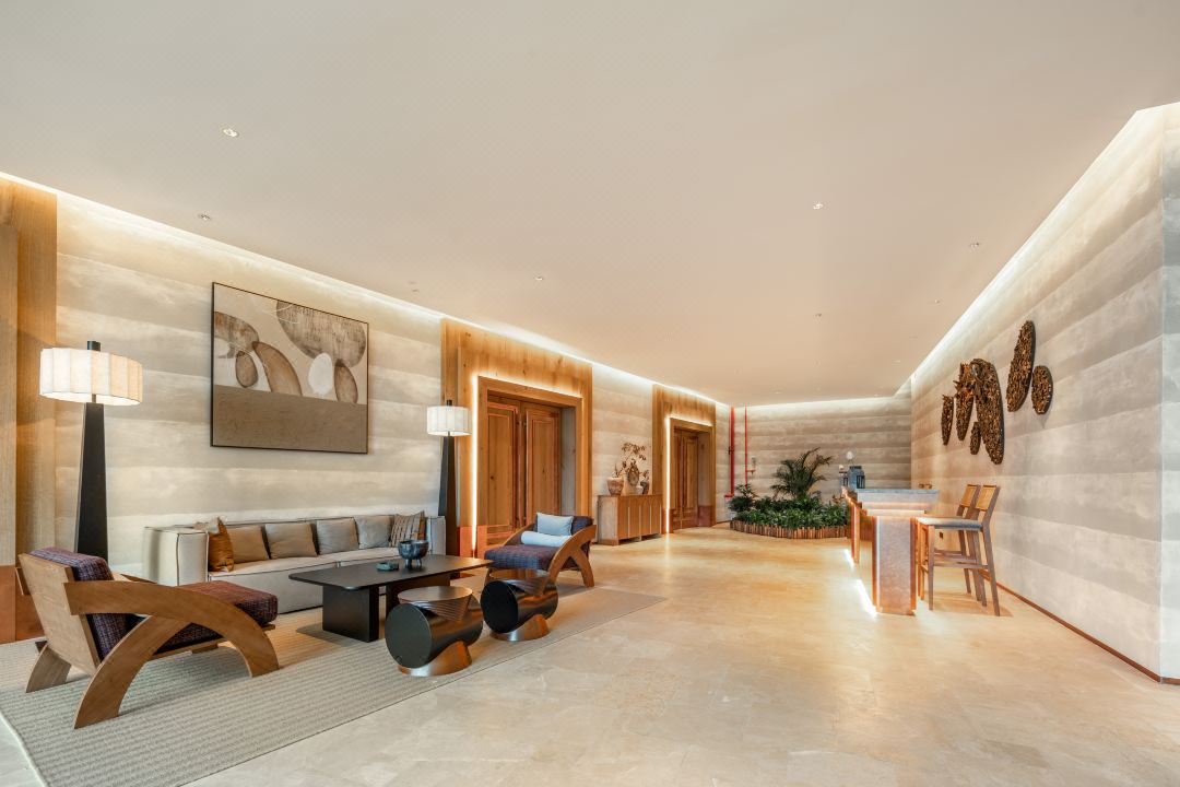 休闲区于天花安装的防眩射灯做洗墙照明和提供基础照明,暗藏在天花凹槽处柔和唯美的灯光丰富空间的层次感,同时为宾客提供悠然舒泰的休闲体验。