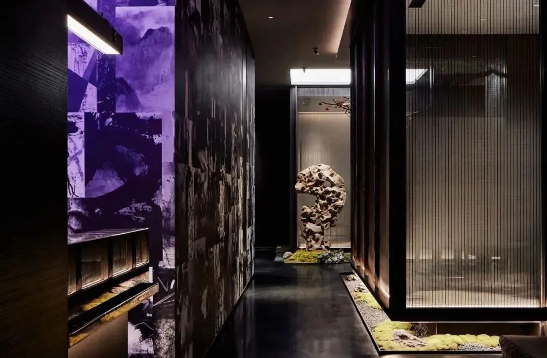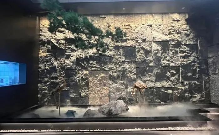 顶上使用嵌入式筒灯做重点照明,暗藏的灯带为辅助照明,两者结合使空间的氛围感一下提升起来,当一束束灯光打在仙鹤上、凹凸的墙壁上,能为顾客打造富有真实感的自然世界。