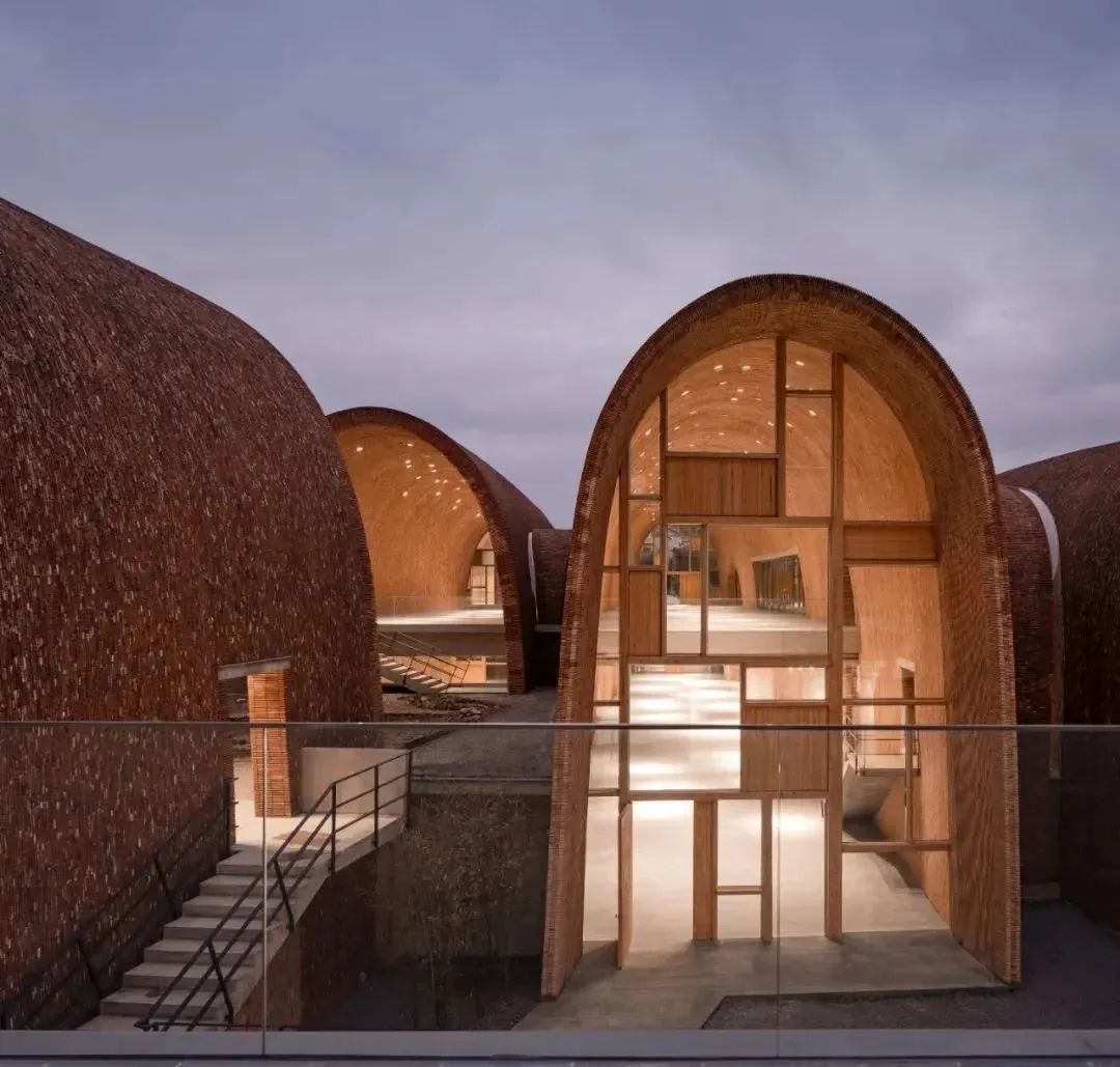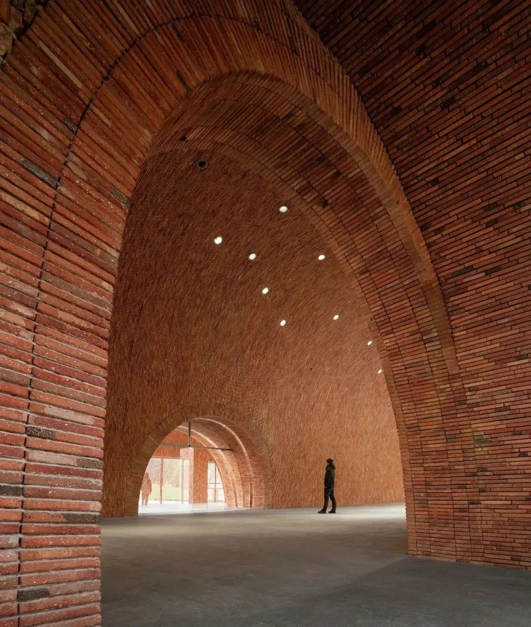 博物馆建筑以模仿老砖窑的拱顶为建筑语言,由八个长度不一、大小各异的多曲面钢筋混凝土拱体结构构成,拱顶借鉴传统窑炉的砌筑工艺,通过内外两侧两层砖之间浇筑混凝土手工建造。