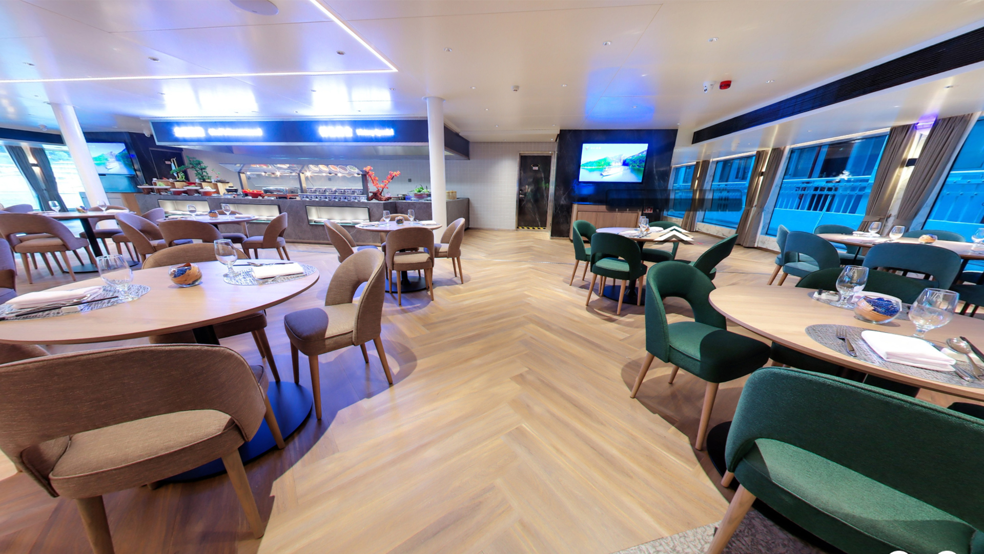 环球餐厅横跨2-3层,创新采用卡座餐桌形式