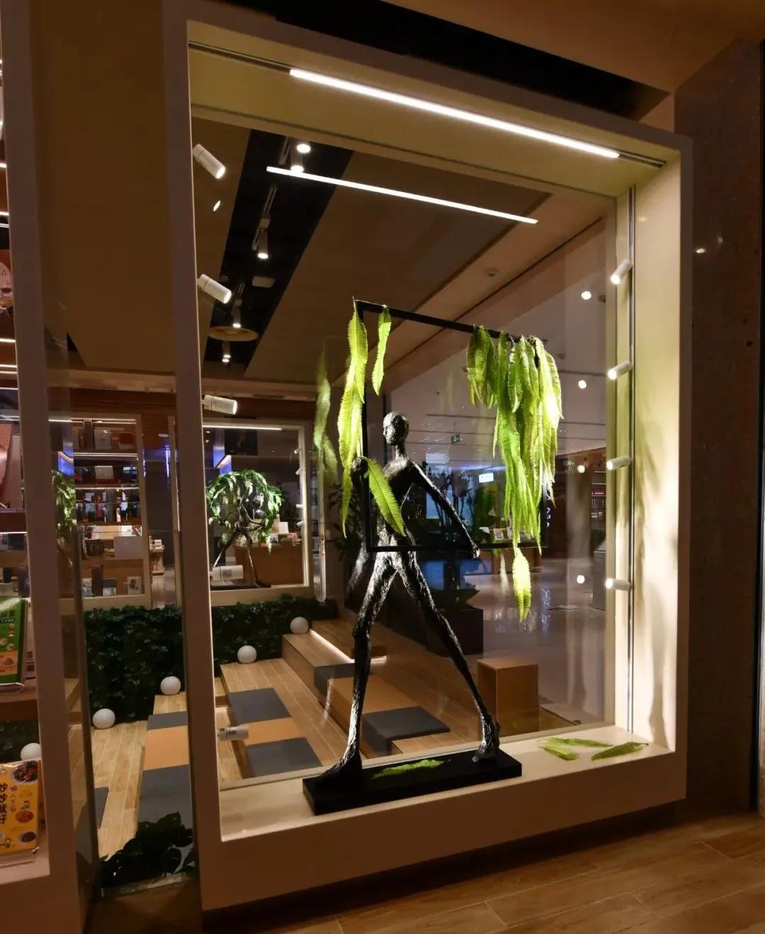 橱窗里的艺术装置是毕业于英国DMU大学建筑设计学院的张宇轩设计,名为“共生”,它所表达的中心思想是人与自然和谐共处,贴合读书阁艺术文化、绿色自然的主题。展柜边缘放置的Geosheen极成灯带和轨道灯营造重点且无眩光的照明环境,给人以与众不同的美学体验时,还可在视觉上突出展品。