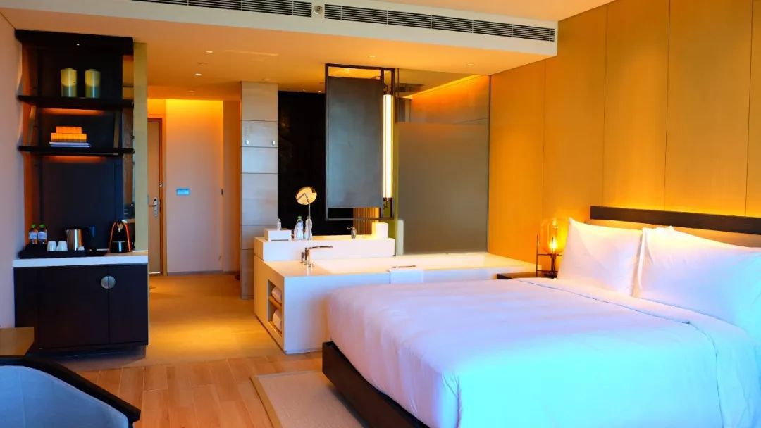 客房的照明设计尤其注重友好的住客体验和舒适的居住感受。客房内光影设施齐全,暖色系装饰材料在暖色灯光氛围烘托下,更显空间的舒适。如此精心打造了舒适宜居的环境,使入住者更容易获得身心的放松。