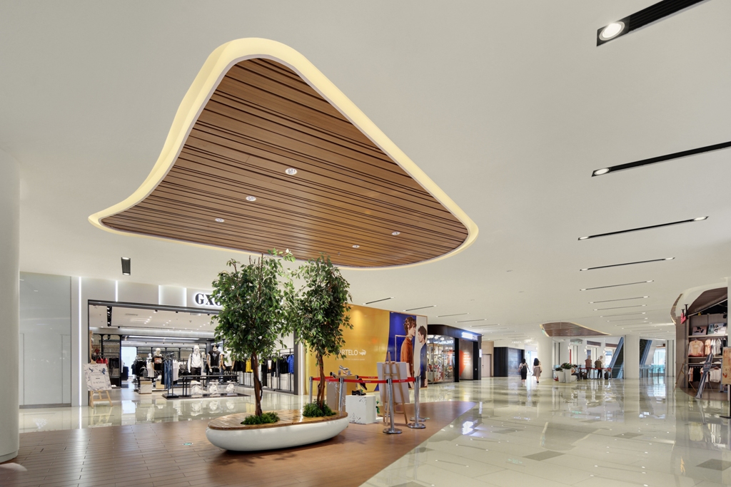 因此购物中心的公共区域整体环境氛围需要分布均匀、稳定的光线,色调轻柔闲适为佳。整体氛围有了,则需要有一些装饰照明、重点照明来增加空间的层次感,提升空间的审美,以符合“轻奢”的定位。