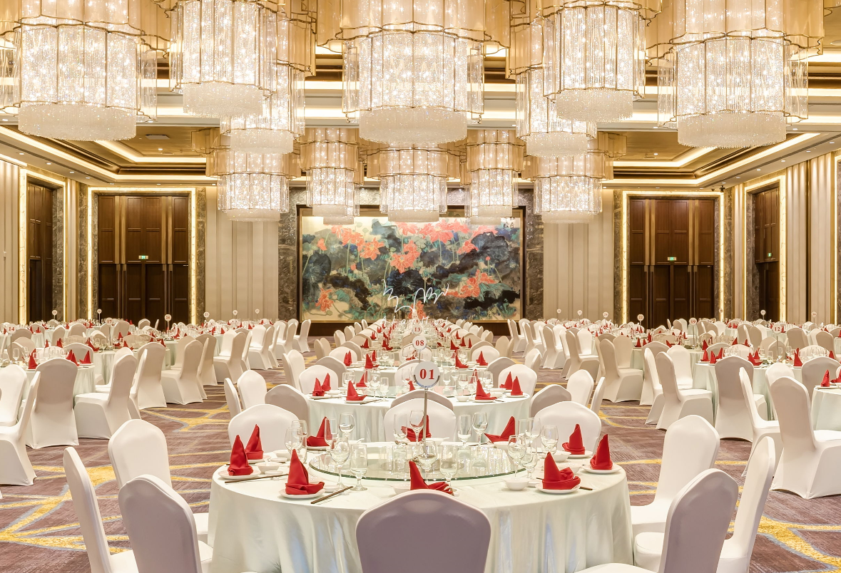 宴会厅主灯能直接决定其空间气质。宴会厅选取的这款莲花花灯,神形兼备奠定宴会厅不俗的格调——莲花花瓣与花梗的线条为形,半透明灯具材质、水晶与点状光源的搭配,“不蔓不枝,中通外直”的君子气度表达得形神具备。