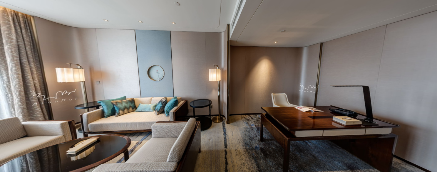 客房基础照明的暖色调配合空间蓝绿、紫红的低饱和度高级色调,配合暖色的少许光斑打亮立面,空间情绪酝酿着温馨和体贴,氛围上先行给入住者周到的舒适体验。而落地灯造型取莲花造型,似是随意安置沙发一角,收拾别致精巧,生出偏安一隅的雅致意趣。入门即给入住者一种,恬淡自然,极有生活品味和追求的高级感。