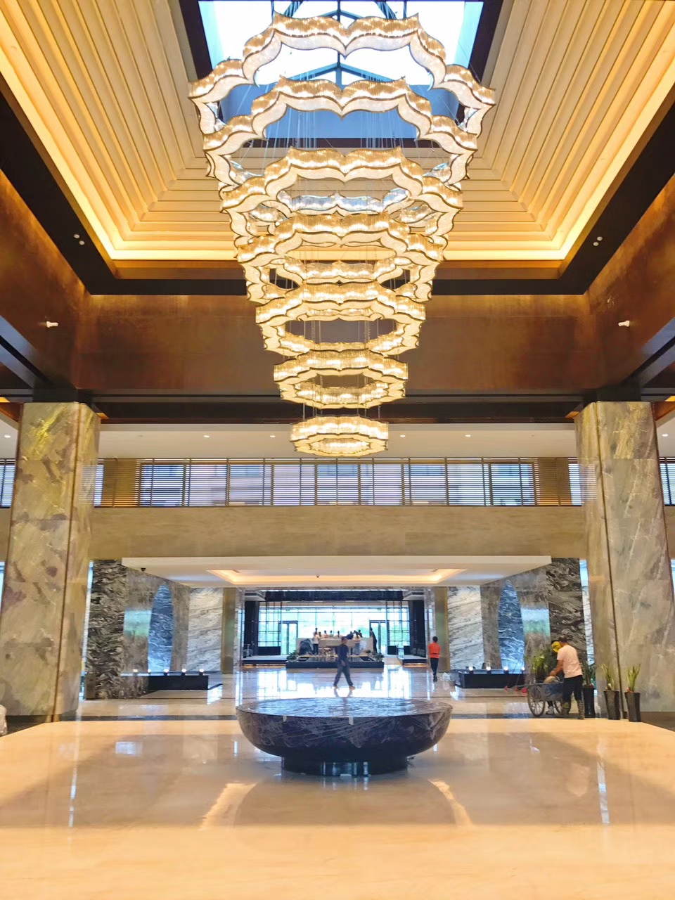 其大堂的硬装与软装杂糅现代美学技艺与中国传统风骨,以江水纹波做基础元素,由此幻化成曲线、莲花、龙腾等意象,大面积应用这些元素以此强调空间调性——落地屏风、柱子饰面、莲花造型吊灯,辅以采用简约的现代线条与技术工艺的家具饰品点缀,且其灯光效果也很恰当地衬托了中国风的设计元素,基础照明控光良好而不滥用灯光,光环境氛围相当友好。这多方的配合,最终让莲花山庄的酒店大堂呈现出现代简约与中式风雅两种美学相融的极致视觉体验。