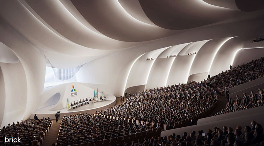 各场馆合起来是一个水滴的形状,体现清洁可循环的主题,场馆中心的玻璃球型建筑为哈萨克斯坦馆,四周则是100多个参展国的国际馆及主题馆,企业馆。在备受关注的哈萨克斯坦2017阿斯塔纳世博会上,哈萨克斯坦馆、中国馆、印度馆、俄罗斯馆、上合馆等全部对外开放。