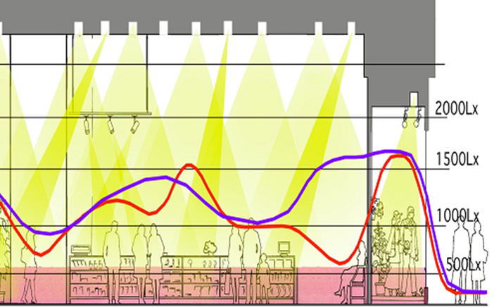 有时,高档的商品、高档的店铺、高档的装修,却配以低劣的照明,强烈的眩光使人无法停留。