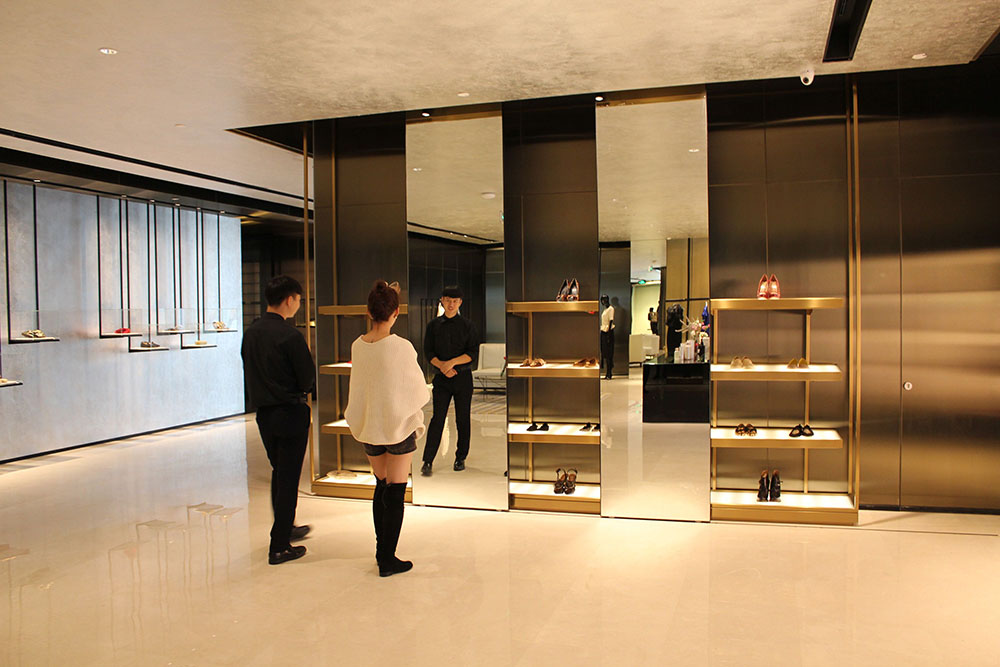 图:北京某商场一层的店,店面陈列和灯光使用均可圈可点,但据小编观察,在旁边店铺人流量很高的周末,半小时内此店无人进场。很大一个原因就是灯光调试环节出了问题:图中红圈处有三四盏灯直射店铺入口和动线,形成刺眼的不舒适眩光。陈列距离消费者太远,退缩空间造成的距离感也是一种原因,“高冷”需要掌握平衡。